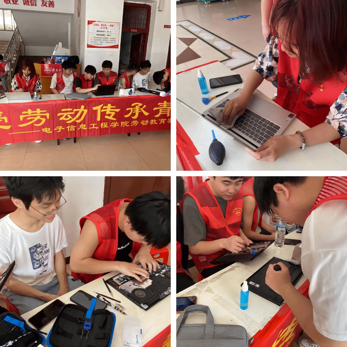 活动现场,服务队志愿者们各尽所长、分工协作,为前来询问的同学详细介绍电脑维修的基本原理和流程,讲解维修电脑中常见的问题及解决方法,并动手帮助解决加装硬盘、积灰清理等电脑问题。他们在浓厚的劳动氛围中,充分运用所学,发挥专业特长,团结通力协作,在力所能及的范围内为同窗提供帮助,展现出信息学子团结友爱、互帮互助的精神风貌,同时也进一步提升自我素质和技能水平。