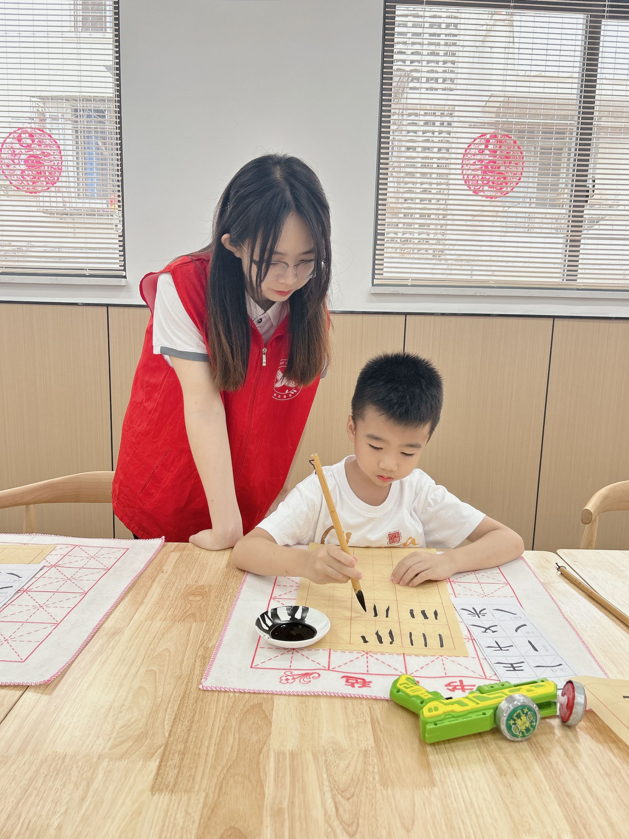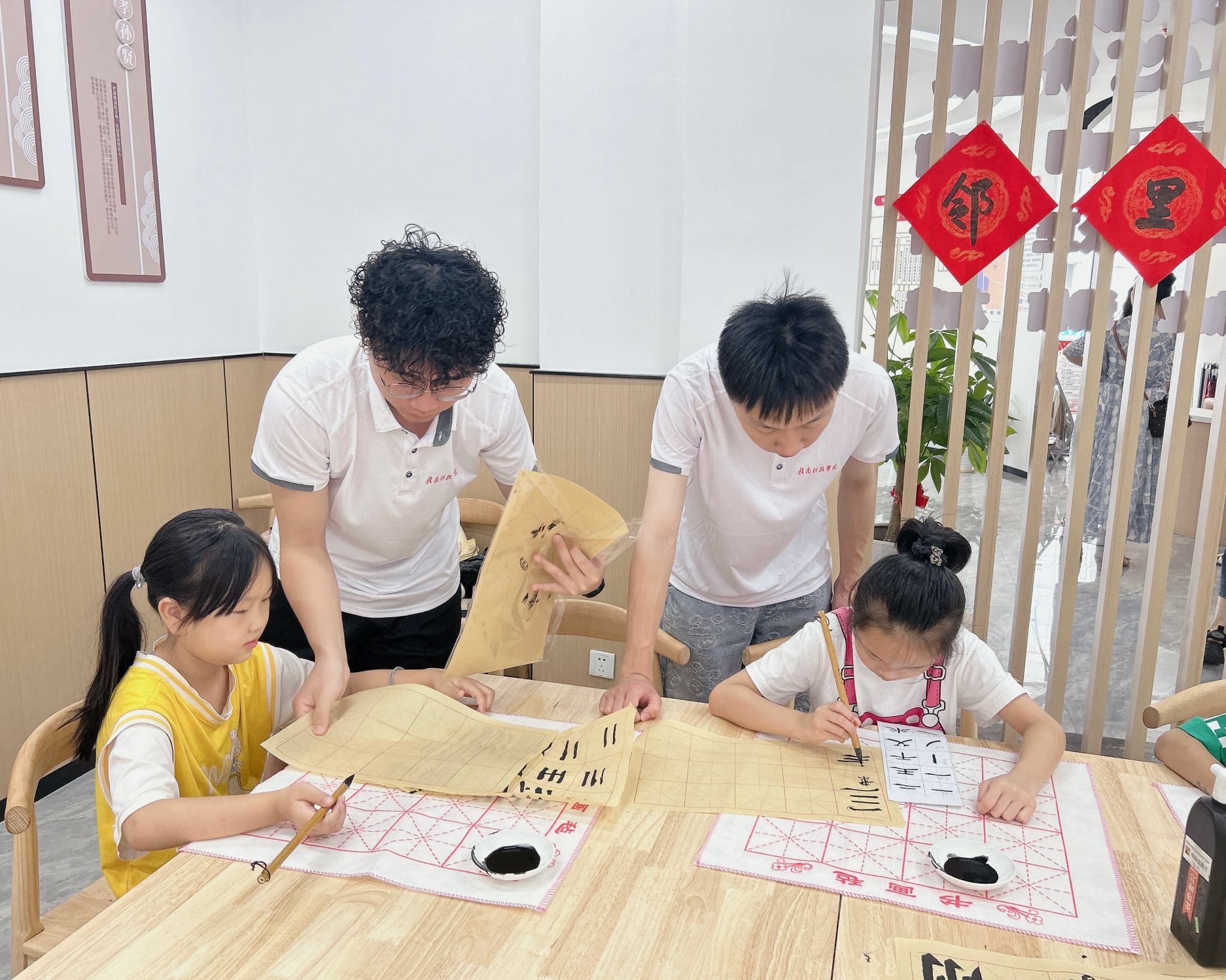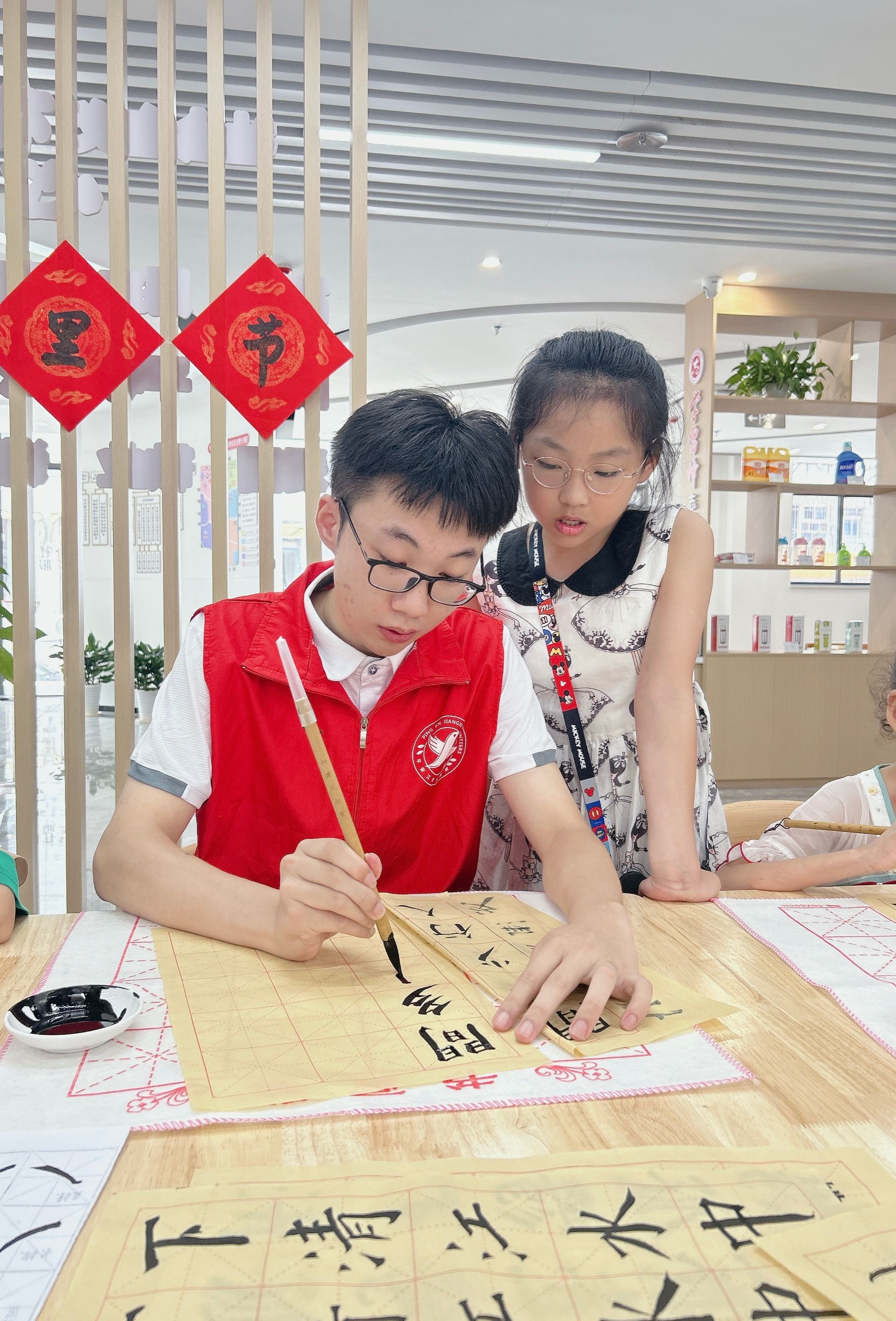 书法课堂上,小朋友们劲头十足,志愿者们耐心细致地讲解书写要点,手把手地指导握笔姿势、书法笔画。一横一竖,一笔一划,小朋友们用心书写每一个汉字,现场墨香浓郁,引领青少年领略中华书法之美,提升艺术审美能力。同时,进一步引导我系学生志愿者在文明实践服务中了解增强时代责任感、提高社会实践工作能力。