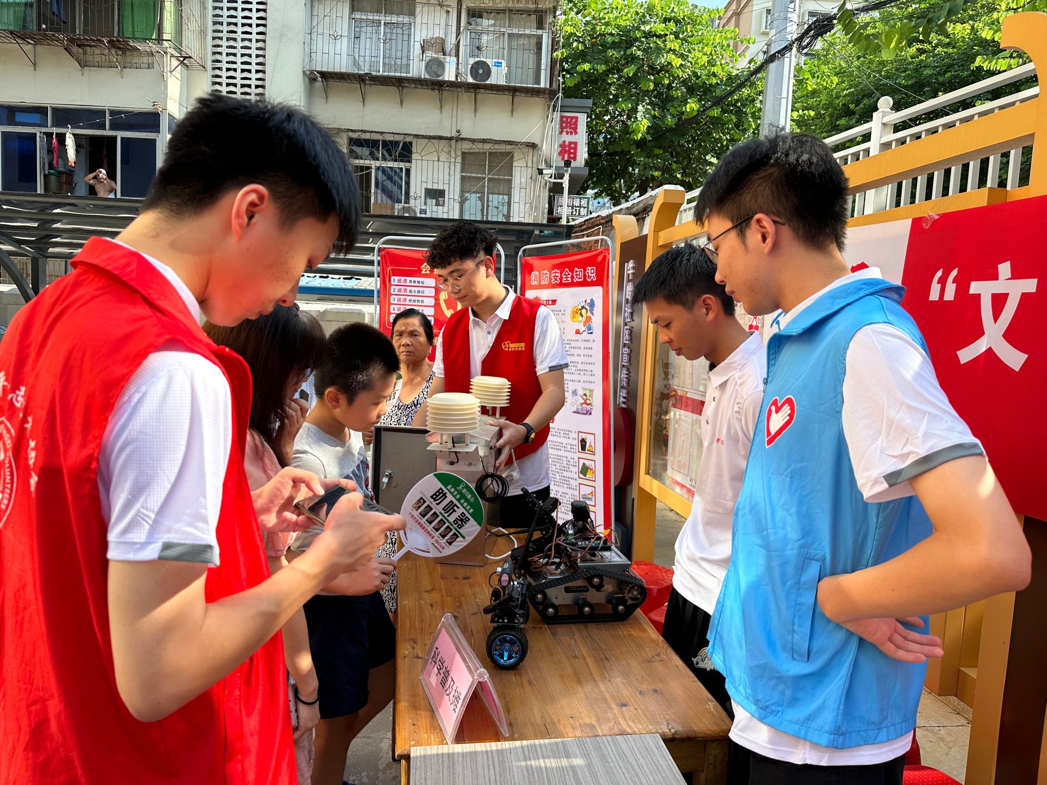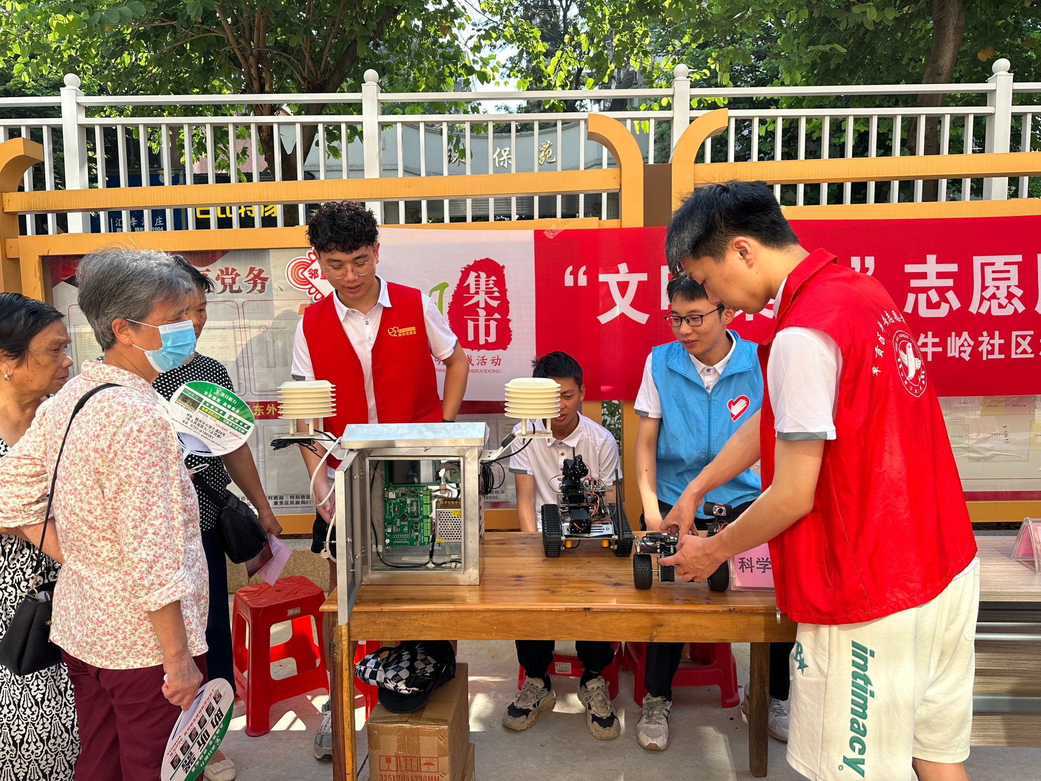 本网讯:科技惠民,在社区“沉浸式”体验科技魅力。8月3日,beat365正版唯一官网信息工程系“三信实践队”加入牛岭社区文明集市,以社区“摆摊”群众“赶集”的形式,面向社区居民举办电子科技展览,丰富公众文化生活,传播新时代文明实践正能量。