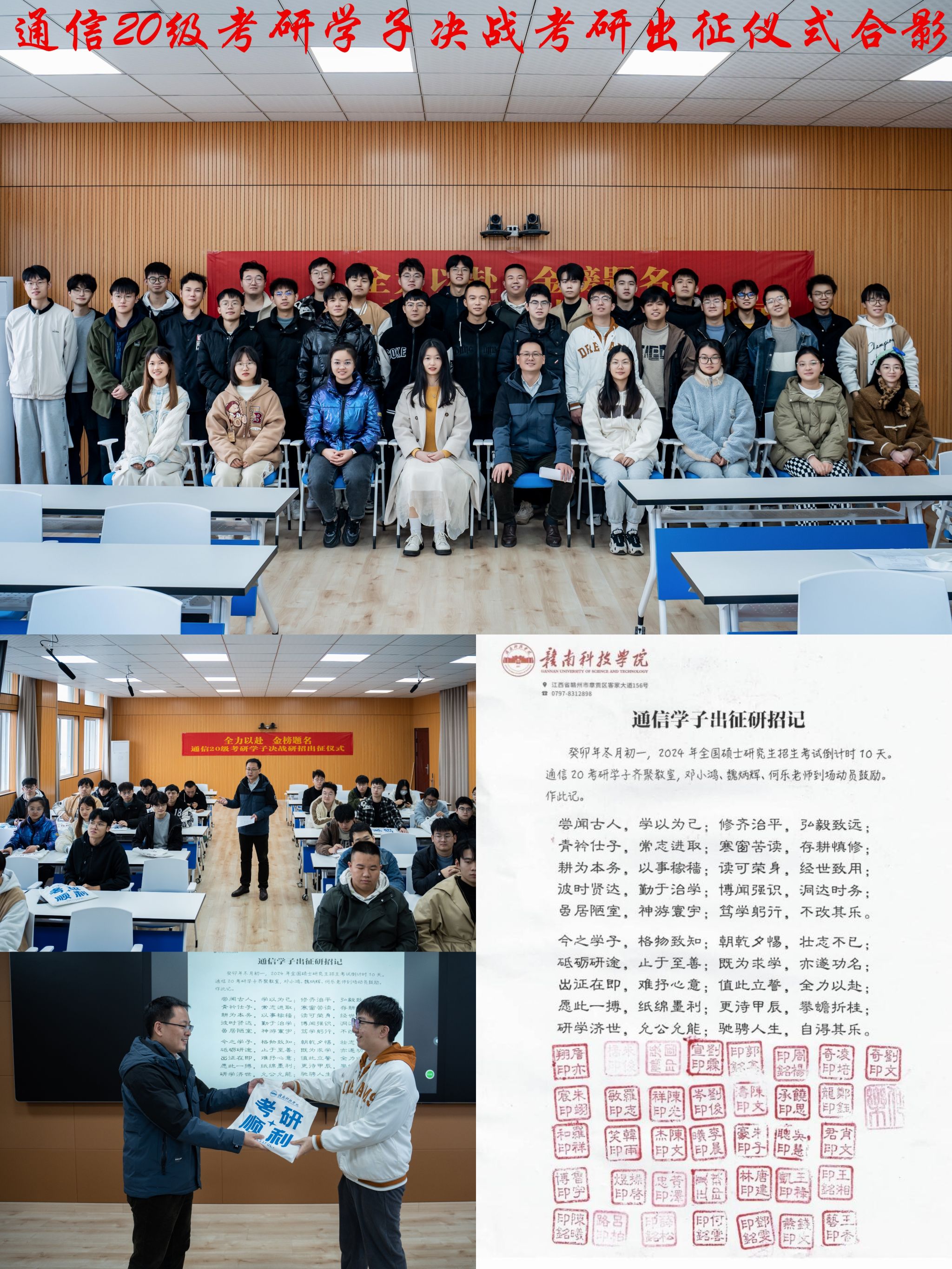 印石为誓,金榜题名——12月13日上午,通信专业在崇善楼Z623召开考研冲刺会,班主任何乐为考研学子送上专属印章和考研大礼包,并鼓励同学们在最后阶段要以咬定青山不放松的韧劲坚持下去,卸下思想包袱,调整好心态,合理调整作息,以最佳状态走入考场。