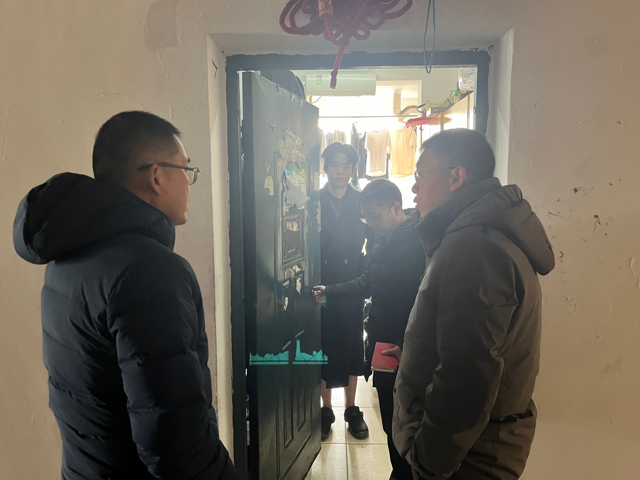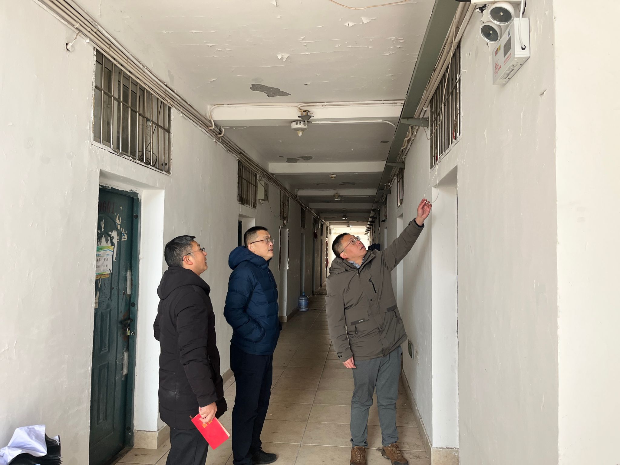 随后,一行人前往学生宿舍,了解暂未离校学生近况,并且叮嘱日常用电安全,之后还逐间检查了学生宿舍的封条情况、宿舍楼的消防设施以及楼道通道的畅通情况。