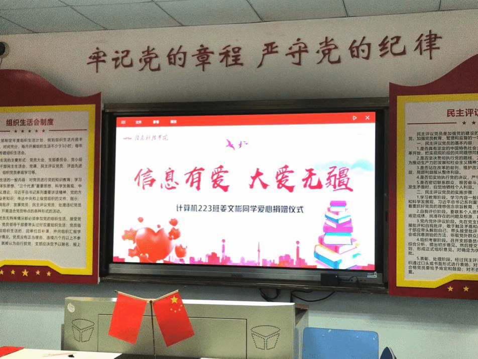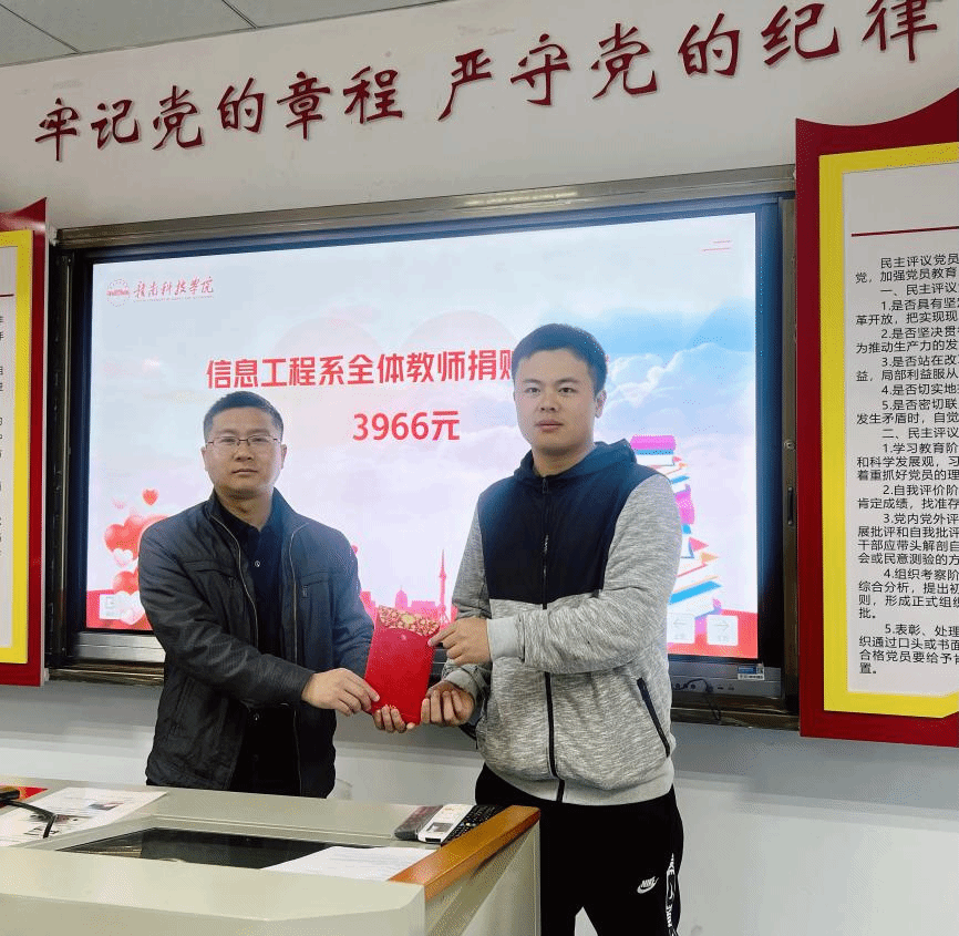 本网讯:为帮助信息工程系身患骨肉瘤同学渡过难关,传递学校师生的温暖力量,3月13日,信息工程系在一教1201室举行了姜文彬同学爱心捐赠仪式。系党总支书记邓小鸿、副主任魏炳辉、学生党支部书记吴宪、团总支书记陈世琪和计算机233班班主任雷初聪参加了本次仪式。