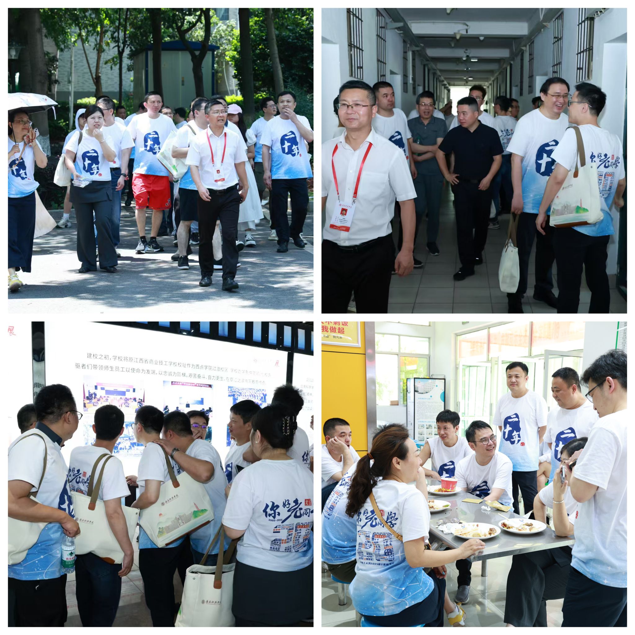 随后,校友们在学院教师陪同下参观校园、走访宿舍、漫步教学楼与实训中心,感受母校十余年来的飞跃发展;在校史馆中驻足留影,回顾学院创建与演变历程,深受感动。中午,校友们在学校食堂共进午餐,回溯校园时光的点点滴滴。