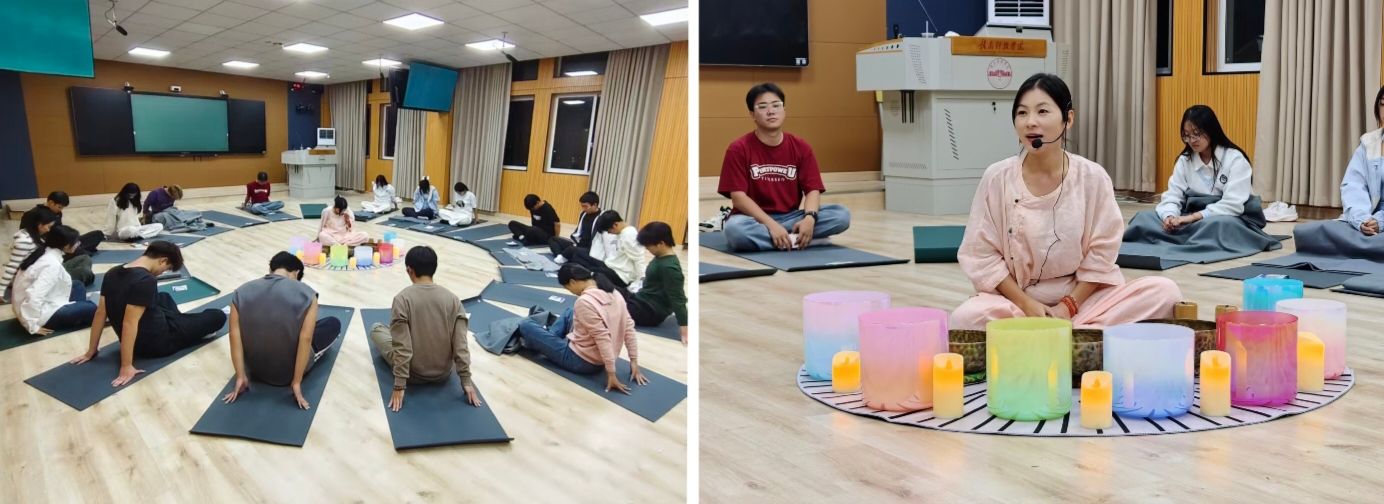 随后开展的“颂钵音疗”环节,将活动氛围推向高潮。场地灯光缓缓暗下,仅留每组蜡烛围成的暖柔光晕,营造出静谧而治愈的氛围。同学们在老师指引下轻闭双眼,全身心沉浸于颂钵声波的共振之中 —— 悠扬深沉的钵声似有魔力,轻缓抚慰着疲惫的心灵,让大家暂别外界的喧嚣纷扰。
