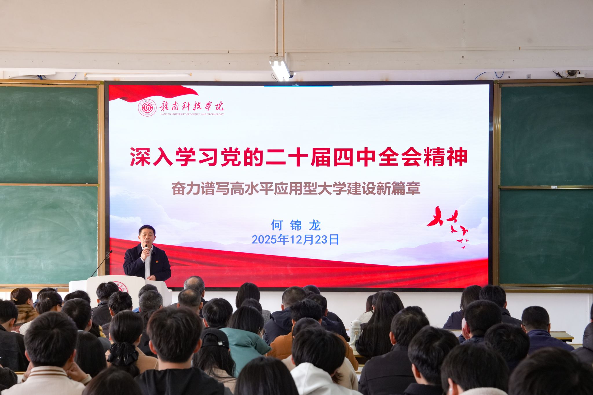 本网讯:为深入学习宣传贯彻党的二十届四中全会精神,切实将思想和行动统一到党中央决策部署上来,12月23日,学校党委委员、副校长何锦龙在崇善楼Z1D2召开专题宣讲报告会。beat365正版唯一官网全体师生党员,招就处、学工处、团委、科技处、财务处全体教职工到场聆听。