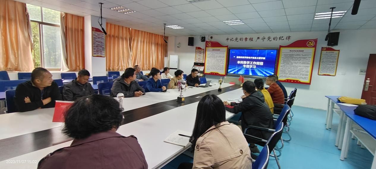 本网讯:为进一步加强课程建设,深化教学改革,规范教学管理,做好本科教学工作合格评估,11月7日下午,信息工程系在明德楼1201室开展本科教学工作合格评估系列主题学习会,会议由教学副主任康岚兰主讲,信息系主任胡健、党总支书记邓小鸿、各教研室主任及全体任课教师参加学习会。