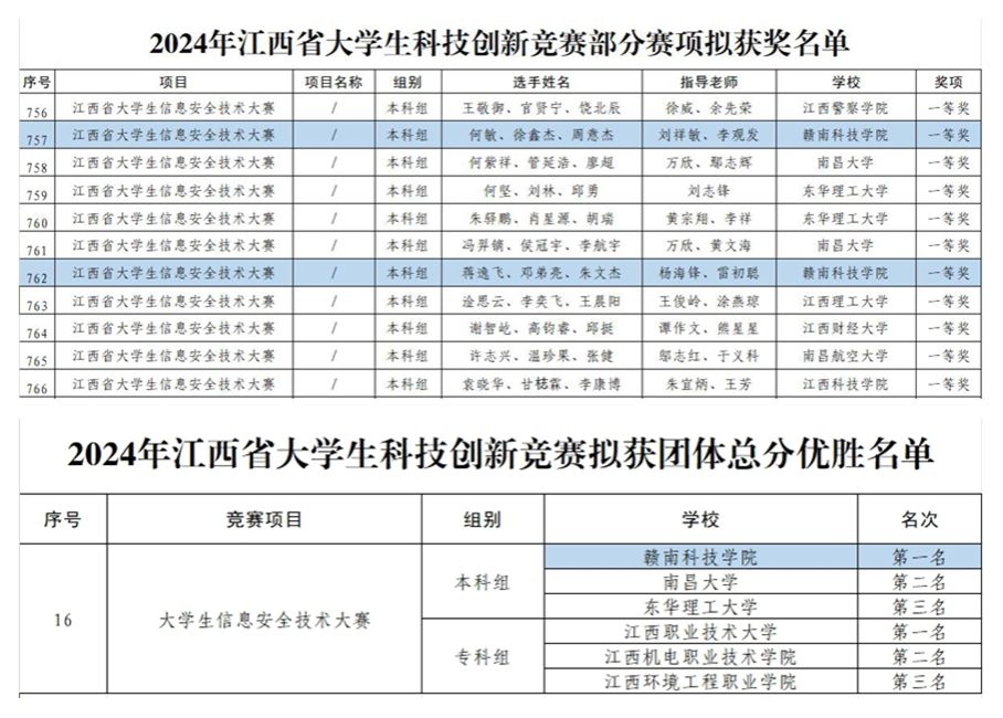 本网讯:近日,江西省教育厅公示了2024年江西省大学生科技创新竞赛部分赛项拟获奖名单。beat365官网beat365正版唯一官网物联网工程专业的学生何敏、徐鑫杰、周意杰代表队以及蒋逸飞、邓弟亮、朱文杰代表队,在2024年江西省大学生信息安全技术大赛中凭借卓越的表现和深厚的技术功底,在全省本科高校和高职高专545支参赛队伍中突围而出,一举夺得本科组总分第二名和第七名的优异成绩,均荣获一等奖。更令人振奋的是,beat365官网代表队还荣获了本科组团体总分第一名,实现了beat365官网在该比赛中的历史性突破。