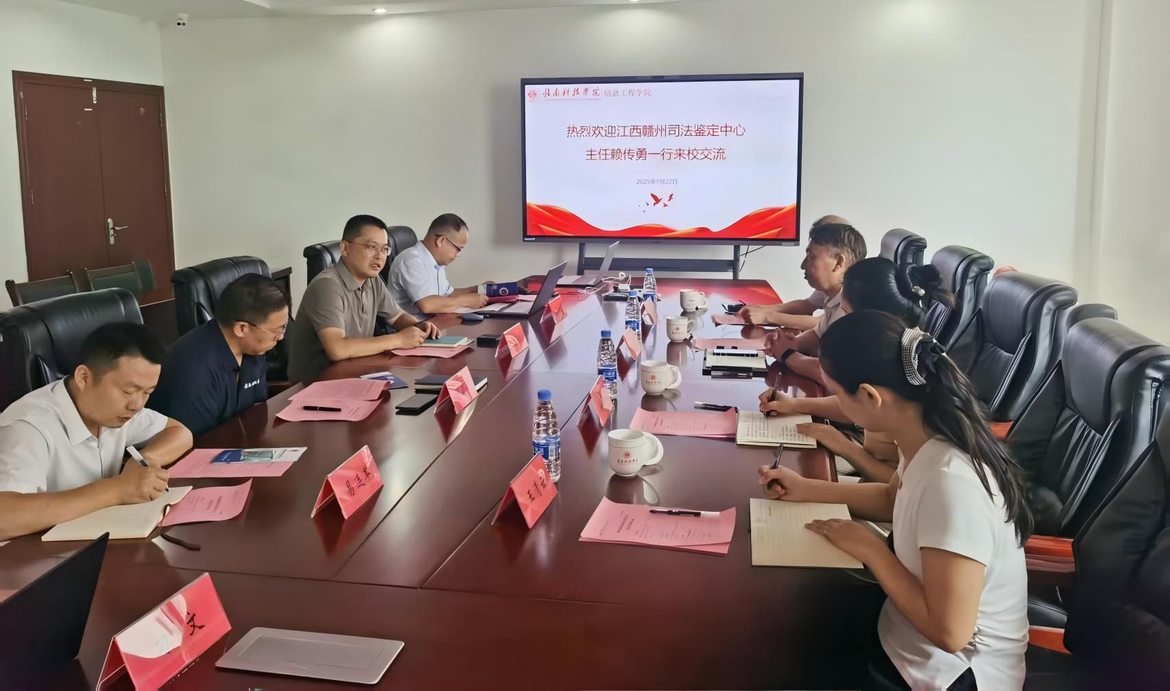 本网讯:7月22日上午,赣州司法鉴定中心主任赖传勇一行到beat365正版唯一官网交流,beat365正版唯一官网党委副书记邓小鸿,党委委员、副院长胡健,党委委员易连军、网络空间安全教研室主任李观发及专任教师代表参加座谈会。