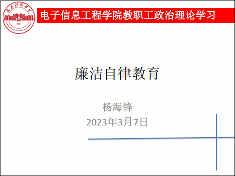 其次,杨海锋同志结合“高校教师违规腐败”的典型案例开展了警示教育。他指出,廉洁从教要从三方面入手。一是要教学廉洁。在教育教学活动中公正执教,平等对待每一位学生,体现师者风范、学者美德;二是要科研廉洁,在科研活动中端正学术态度,尊重学术道德,遵守学术规范;三是要育人廉洁。教师要言传身教,用自己的良好道德、高尚品德来影响学生、感化学生,做到真心热爱学生、正确引导学生。