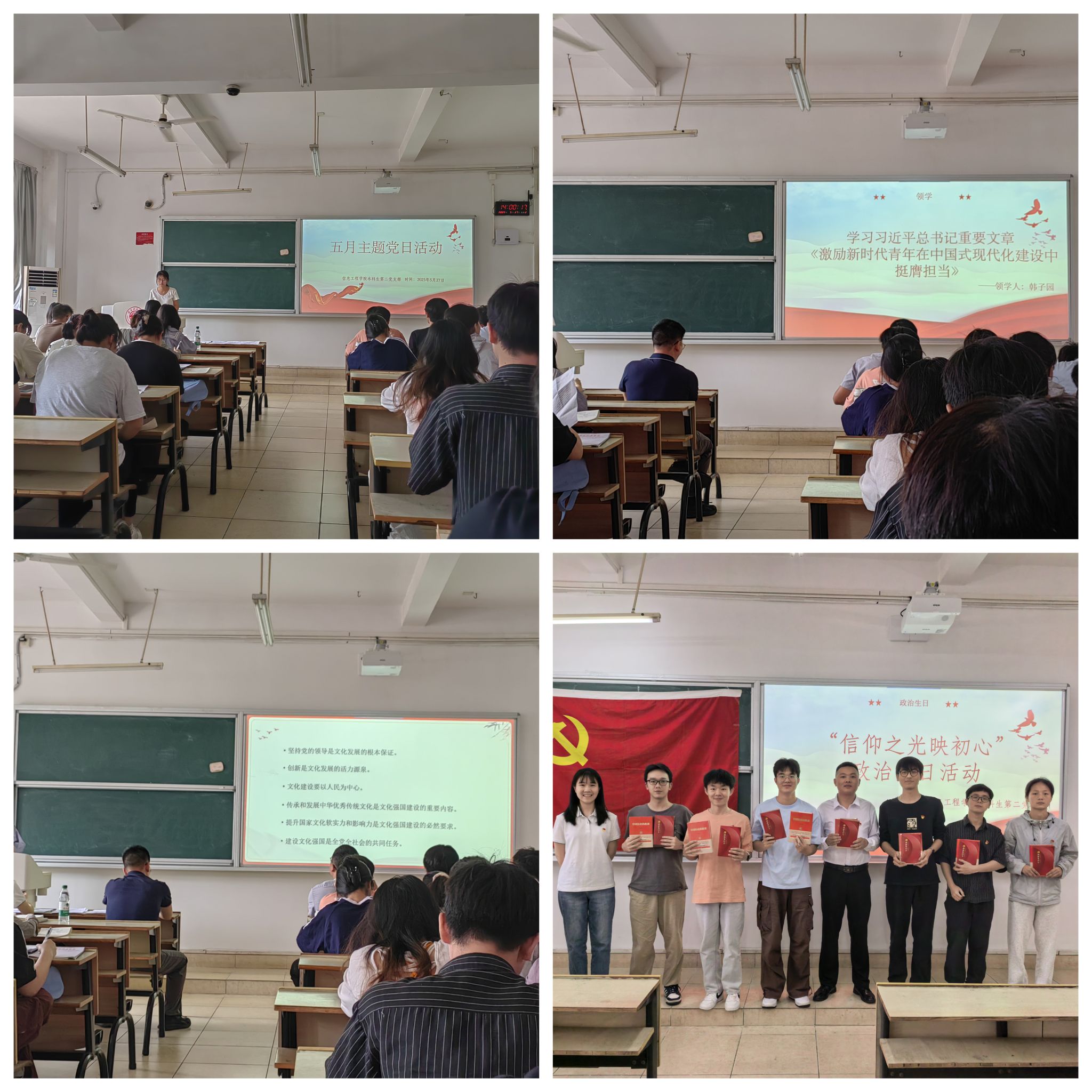 此外,本次主题党日活动还举办了“信仰之光映初心”政治生日活动,支部为5月份过政治生日的党员同志精心举办了政治生日仪式,颁发政治生日纪念卡、赠送书籍,蒋博、吴柯萱同志作为党员代表分享了他们的入党初心,成长故事,带领大家重温入党初心,传承信仰力量。