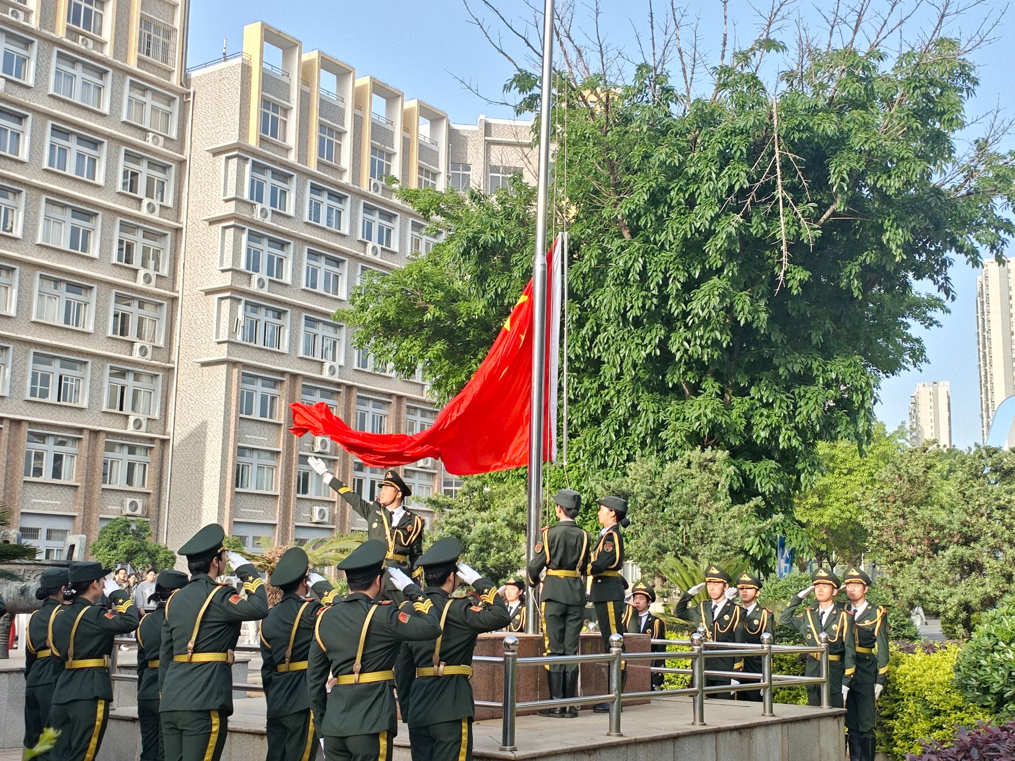 伴随《义勇军进行曲》的激昂旋律,五星红旗缓缓升起,全体师生神情肃穆,行注目礼,奏唱国歌。