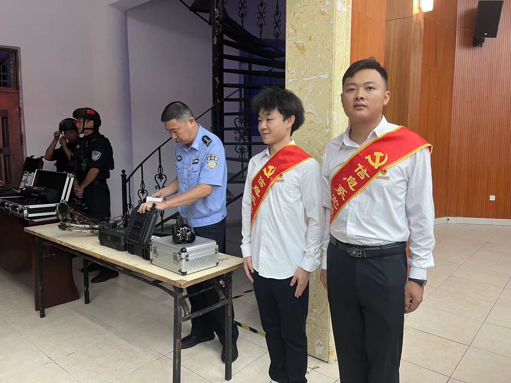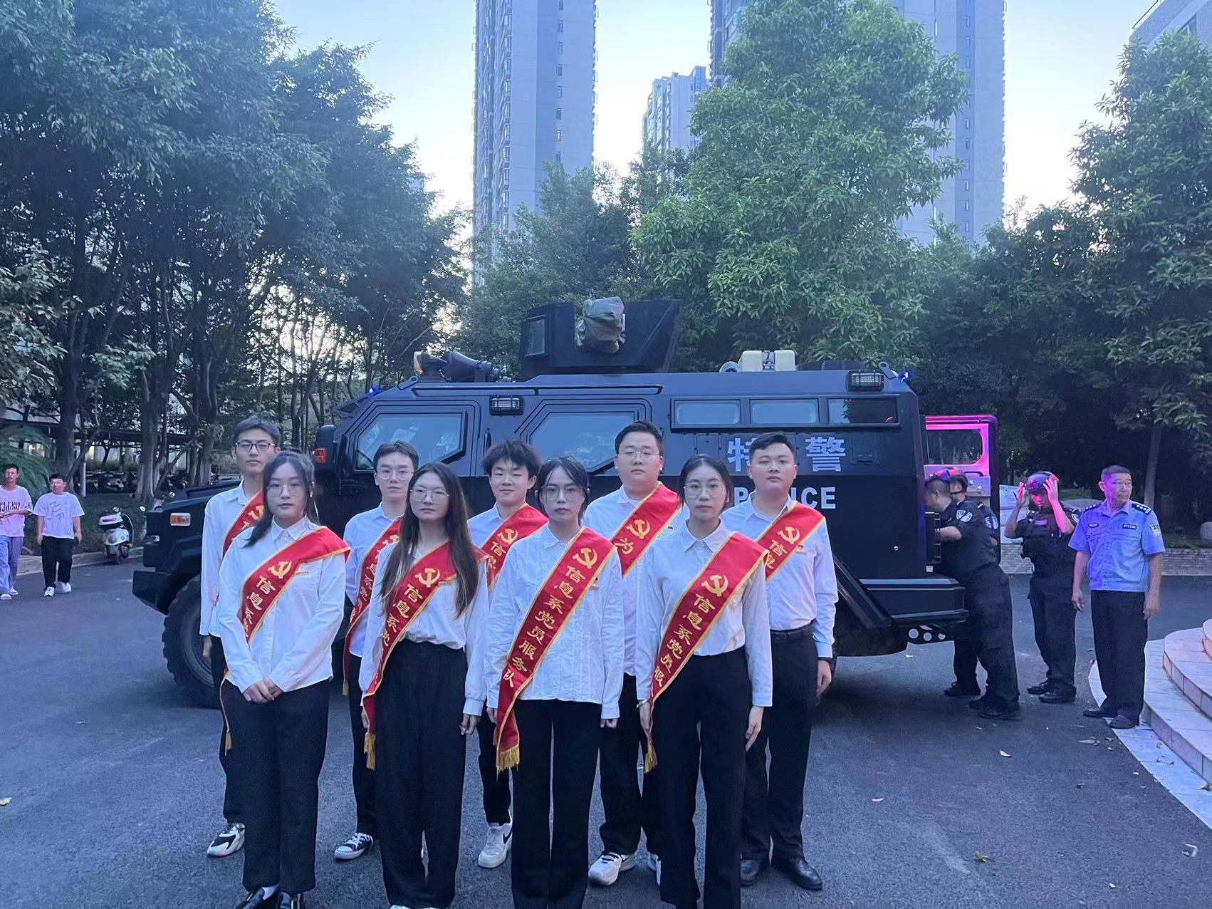 本次活动信息工程系本科生党员服务队协助特警同志对活动进行布场,维护活动秩序,支部党员表示将以党员的身份不断要求自己,以身作则,不断扩大宣传力度和广度。