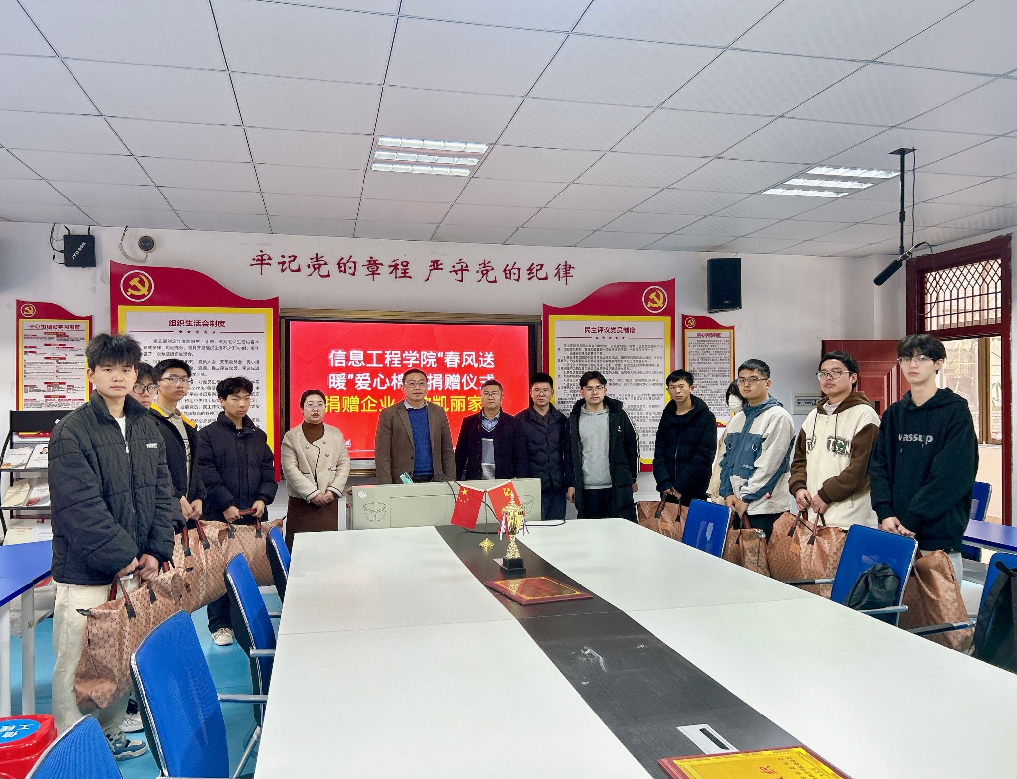信息工程系党总支书记邓小鸿、学工副主任魏炳辉及受助学生辅导员共同为张甜甜等十名受助学生发放由爱心企业欧凯丽家纺提供的爱心棉被。邓小鸿鼓励学生们心怀感恩,希望学生们在新学期继续奋发向上,做豁达开朗的奋进者;自信昂扬,做传递爱心、提高本领的践行者;做学校资助政策的宣传者,让更多同学感受到“资助育人”政策的温暖力量。