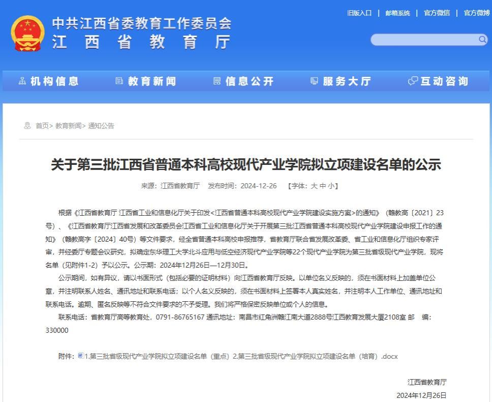 本网讯:12月30日,江西省教育厅、江西省工业和信息化厅联合公布第三批省级现代产业学院建设项目名单,beat365官网电子信息现代产业学院成功入选第三批立项建设重点项目名录,这标志着beat365官网在“产、学、研、用”深度融合、协同发展的又一进步。